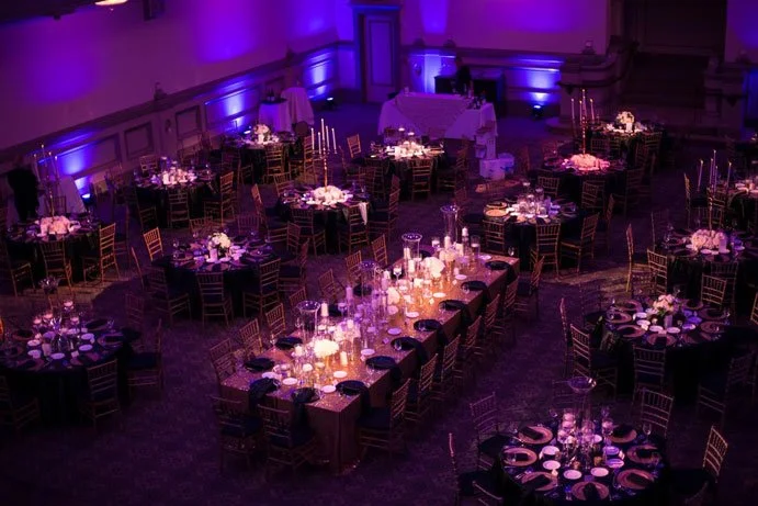 An elegant event space enhanced by colorful uplighting and precision pin spot lighting, creating a polished and memorable environment for corporate guests.