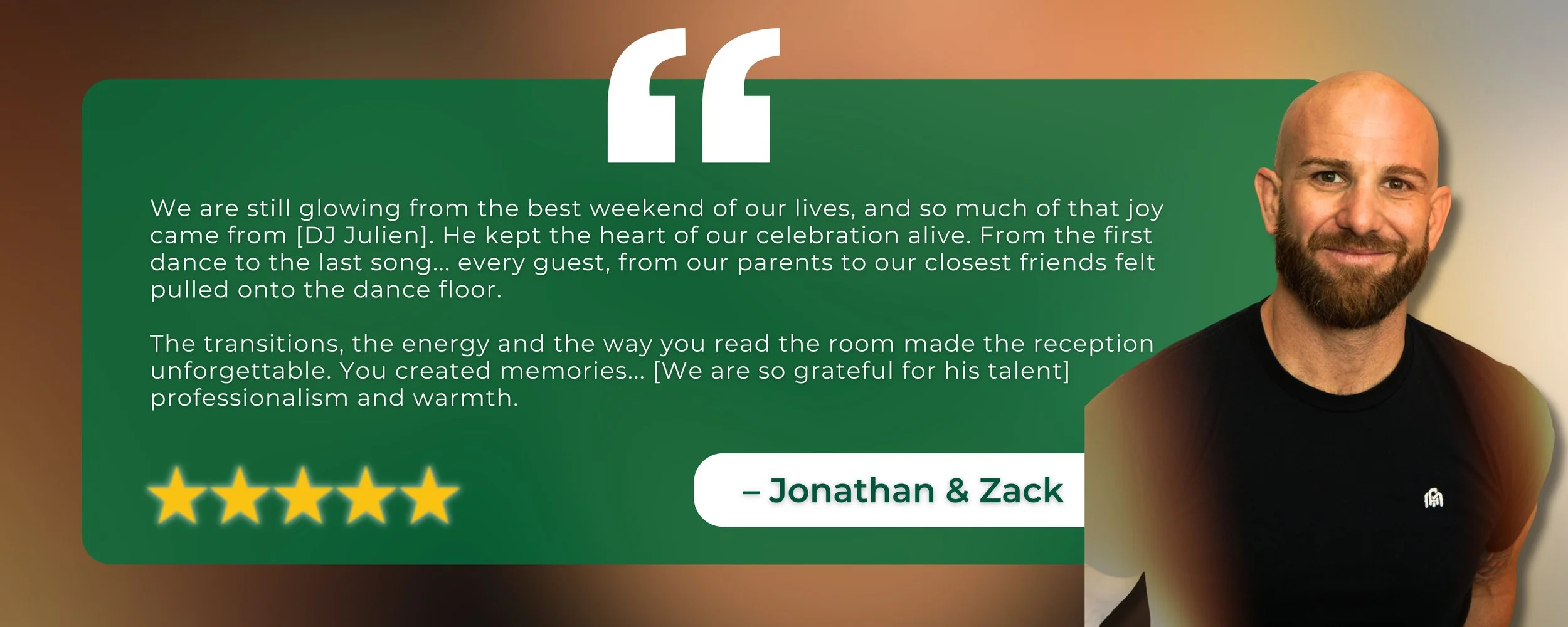 With nearly three decades of experience, Julien is known for his professionalism, versatility, and ability to read a crowd and keep the dance floor full all night long. He specializes in weddings, corporate events, and private celebrations, seamlessly mixing all genres and generations of music to match the energy of every event.