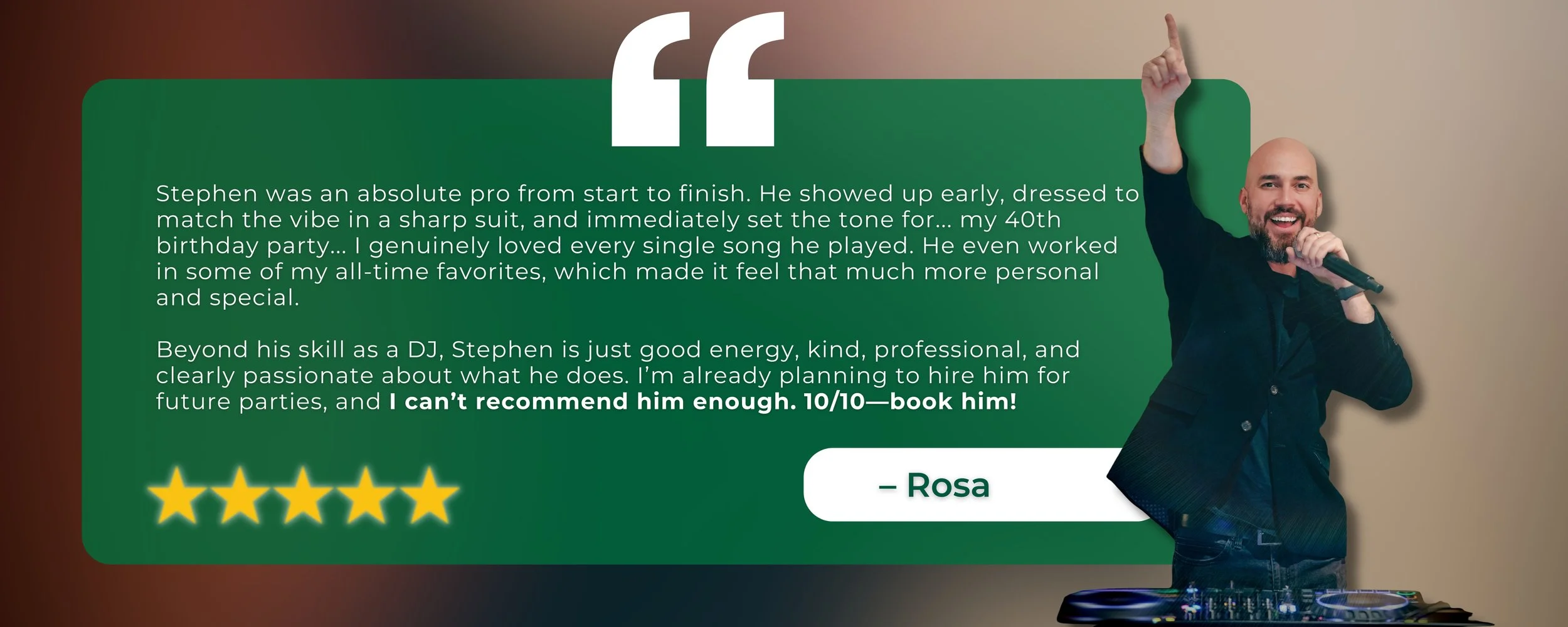 Jose’s calm and professional demeanor, combined with his charisma and adaptability, makes him a favorite among clients. More than just playing music, he creates memorable experiences—ensuring that every event feels unique and special. When you book DJ Jose, you’re not just getting a DJ—you’re gaining a dedicated professional who is committed to making your event extraordinary